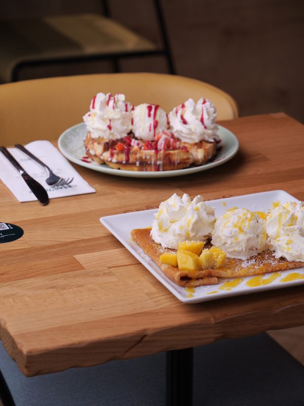 Notre carte comprend des crêpes froment, des galettes sarrasin sans gluten, des gaufres signatures (Star Waffle, Chicken Waffle, Avocado Waffle, Raclette Waffle), des plats signatures comme le Bollywood Brunch (16,50 €), Chicken Dips (14,95 €), Fish & Chips (14,50 €) et Toasté Texan (14,95 €), ainsi que des salades, desserts et cocktails.